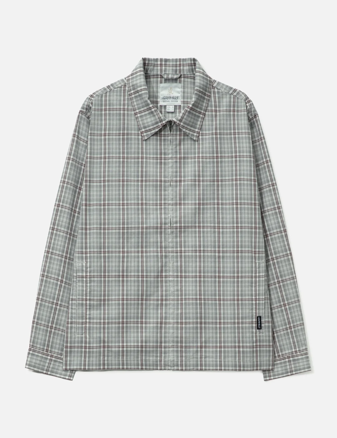 - Gramicci - Zip-Up Garage Jacket - Made of cotton - Allover checkered pattern - Pointed collar - Zipper closure - Long sleeves with button - Two side welt pockets - Brand label at side seam - Color: Natural - Material: 100% Cotton - See more Jackets and Clothing - Model wears size M - Model measures: Height 186cm, Chest 34”/86cm, Waist 28”/71cm, Hip 36”/91cm - Vendor Code: G6SM-J063