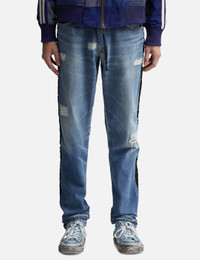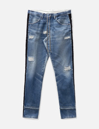 - GREG LAUREN - 34 Tux Denim Lounge Pants - Drawcord at waist - Button fly - Contrasting nylon panels at side - Total 4 pockets - Tapered leg - Color: Medium Blue - Material: 95% Cotton, 5% Nylon - See more Jeans and Clothing SIZING - Model wears size 2 - Model measures: Height 187cm, Chest 36”/91cm, Waist 29”/74cm, Hip 37”/94cm