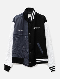 - GREG LAUREN - Black Blanket Varsity Jacket - Made from repurposed fabrics - Snap button closure - Two front pockets - Ribbed trims - Each piece is unique; - Due to the use of repurposed fabrics patterns and distressings will vary for each product - Color: Black - Material: 90% Cotton, 10% Rayon - See more Jackets and Clothing SIZING - Model wears size 3 - Model measures: Height 187cm, Chest 36”/91cm, Waist 29”/74cm, Hip 37”/94cm