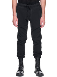 GREG LAUREN pants in black, elastic drawcord waist, side pockets, detachable legs via zipper, skinny fit. Made in USA Japanese Sizing Composition: 100% Cotton Model is 6'3" and is wearing a size 2. Shoulders: 18.5" Chest: 35" Waist: 30"