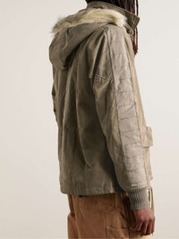 This jacket is just one example of Greg Lauren's patchwork mastery. It's cut for a relaxed fit from panels of surplus army tents - an unconventional fabric that the label often incorporates into its designs. It's trimmed with quilted shell and has a removable faux-fur hood and sizable front pockets. Size & Fit - Size 1 = S, 2 = M, and 3 = L - Fits true to size. Take your normal size - Designed for a regular fit - Detachable hood - Drawcord hem - Mid-weight, non-stretchy fabric - Model is shown wearing a 2 - Model measures: chest 38"/ 96cm, height 6'2"/ 188cm Details & Care - Army-green cotton-blend and shell, cream and black faux fur - Two-way zip fastening - 90% cotton, 10% polyester; lining: 100% polyester