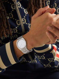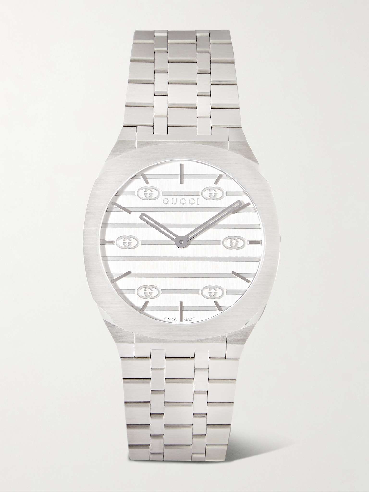 Sporty styles from the '70s inspired Gucci's '25H' watch. Powered by a Swiss-made quartz movement, it has a sleek 34mm profile cast from stainless steel and is centred by a brushed dial, mapped with the emblematic 'GG' moniker. An invisible clasp upholds the minimalist design and ensures a comfortable but secure fit. Size & Fit - Face Diameter: 3.5cm / 1.4in - Strap Width: 1.7cm / 0.7in - Max. Strap Length: 17.6cm / 6.9in Details & Care - Stainless steel case and bracelet - Silver-tone engraved dial, hour and minute hands and indices - Swiss-made quartz movement - Clasp fastening - Water resistance: 3 bar - Two-year warranty - Comes in a presentation box