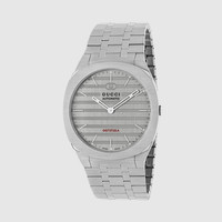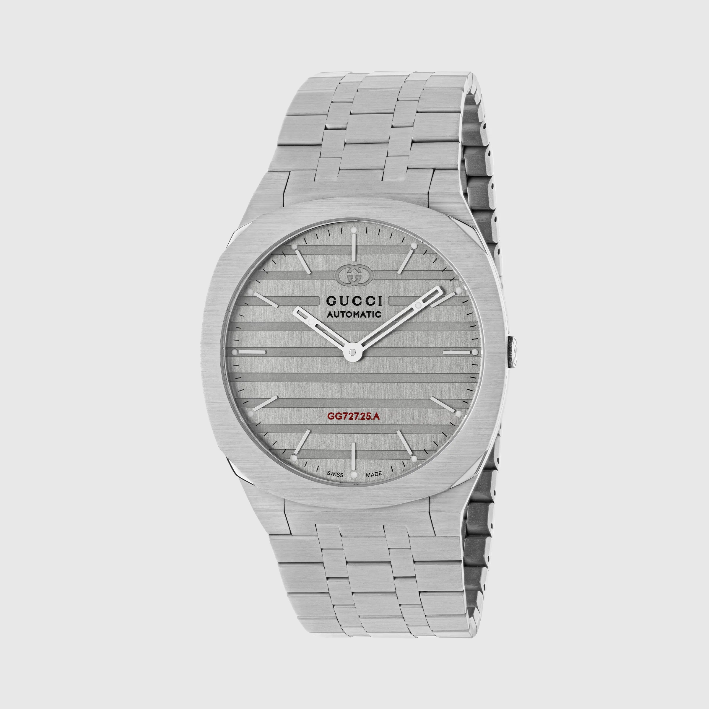 The GUCCI 25H's streamlined silhouette was inspired by the sleek forms of contemporary architecture. The watch is presented with a thin multi-layer case and five-link steel bracelet while the design is completed by the 'GG727.25.A' engraving—a reference to important numerical symbols within Gucci. The name, GUCCI 25H, is attributed to a particularly symbolic talisman for Creative Director Alessandro Michele. - 40mm stainless steel multi-layered case, heavy brushed grey dial with red GG727.25.A caliber engraving, five link stainless steel bracelet - The warranty certificates for Gucci watches purchased after March 1st 2022 are exclusively available online. - Download your certificate at - by using the serial number engraved on the back of your watch. - 3 ATM (30 meters/98 feet) - Sapphire glass with antireflective coating - Automatic movement, GG727.25.A caliber - Wrist size from 4.7" to 7.7" - YA163302 - Swiss Made