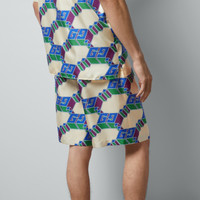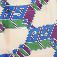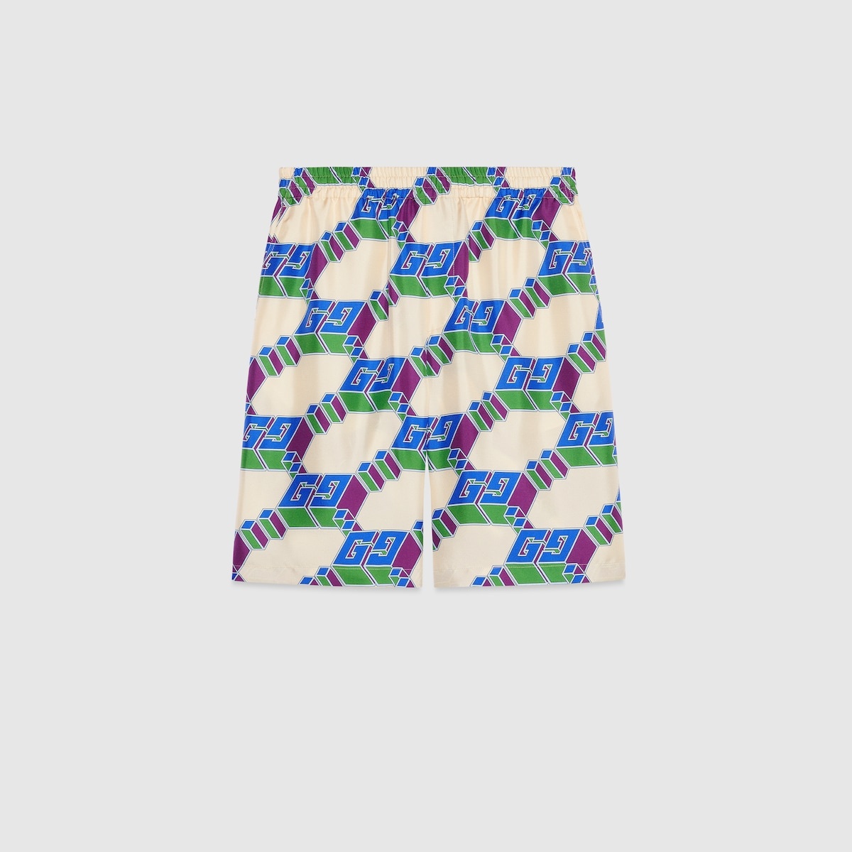 Welcoming warmer days, the men's Cruise 2024 collection presents sportier pieces with vibrant prints. The House logo continues to lend an archival touch, while a vibrant colorway exudes bold modernity. This pair of silk shorts comes to life with a 3D GG print in ivory and blue. - Ivory and blue 3D GG print silk - Elasticated waistband with drawstring - Two side pockets - Back patch pockets - Length: 21.6" based on a size 48 (IT) - Leg opening: 13.7",based on a size 48 (IT) - Made in Italy - The product shown in this image is a size 48 (IT)