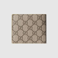 This bi-fold wallet is presented as part of the Pre-Fall 2025 collection. Crafted from GG Supreme, it reveals a contrasting leather interior and a ceramic-effect GG detail. - Beige and dark brown GG Supreme - Acid green leather interior - Brass hardware with acid green ceramic-effect finishing - GG detail - Inside: 8 card slots and 2 bill compartments - Closed: 4"W x 3.5"H - Open: 8.2"W x 3.5"H - Made in Italy - Weight: 0.1lbs approximately