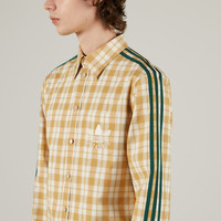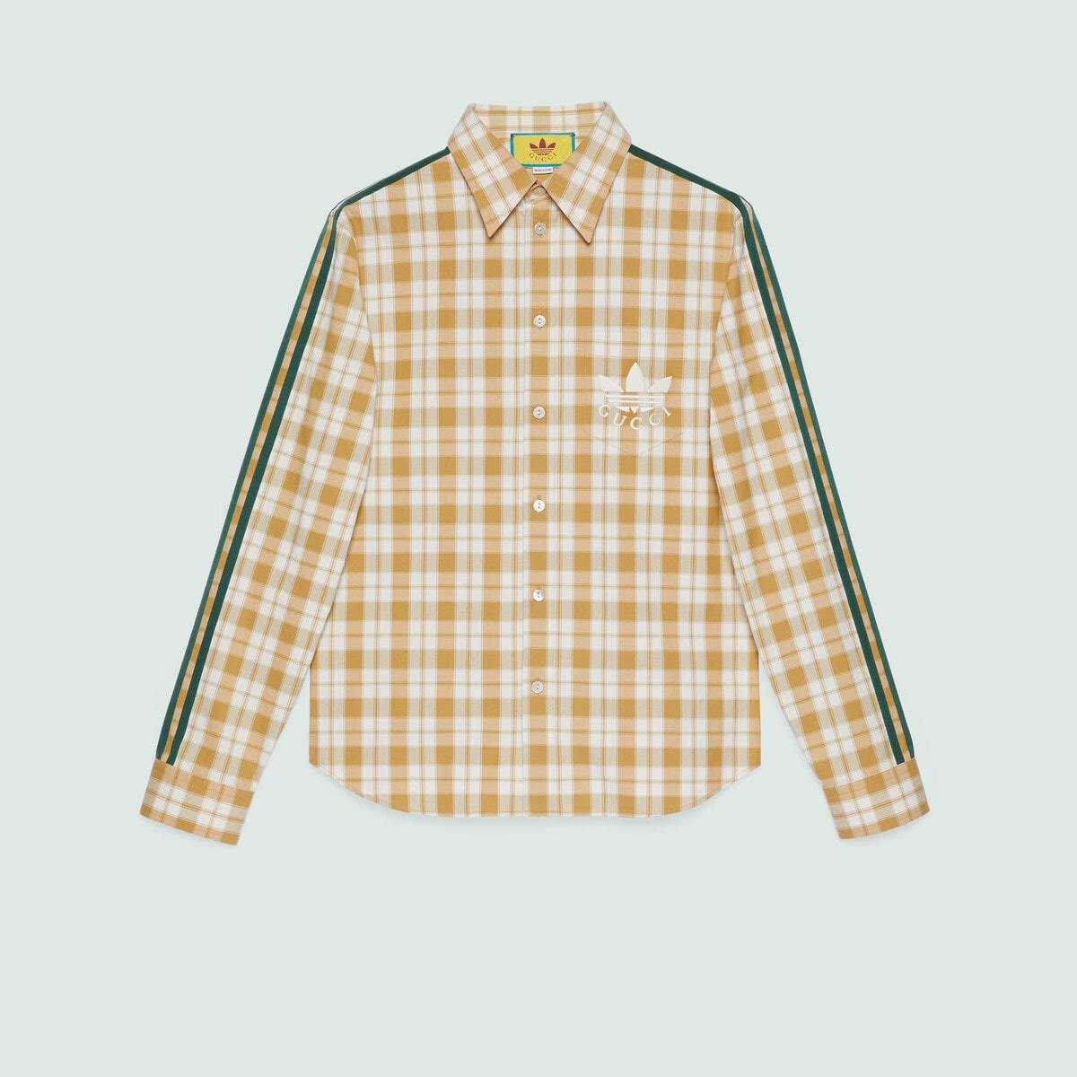 Emblematic House’s motifs mix with those of the historic sportswear brand adidas. The collection sees both heritages encoded in a trio of lines, where adidas and Gucci combine archival emblems. Creative Director, Alessandro Michele pulls inspiration from his memories of the ‘80s and ‘90s for a collection that is both nostalgia-driven and contemporary. This check cotton shirt has the Gucci Trefoil embroidery on the front. - Beige and natural white check cotton - Gucci Trefoil embroidery - adidas x Gucci - 3-Stripe - Point collar - Front patch pocket - Made in Italy - The product shown in this image is a size 15++
