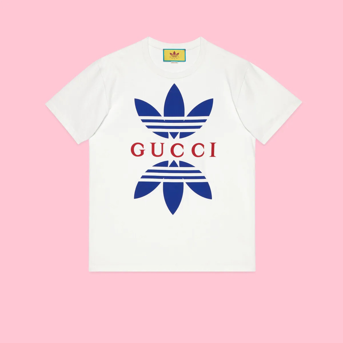 adidas and Gucci venture into a collection, where the Web juxtaposes with the three white stripes, and the GG monogram combines with the trefoil. Pulling inspiration from the Creative Director’s memories of the ‘80s and ‘90s, emblematic House’s motifs mix with those of the historic sportswear brand adidas resulting in a series of hybrid looks. This cotton jersey T-shirt is finished with the Gucci Trefoil print. - White cotton jersey with Gucci Trefoil print - adidas x Gucci - Crewneck - Short sleeves - Made in Italy - The product shown in this image is a size small