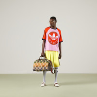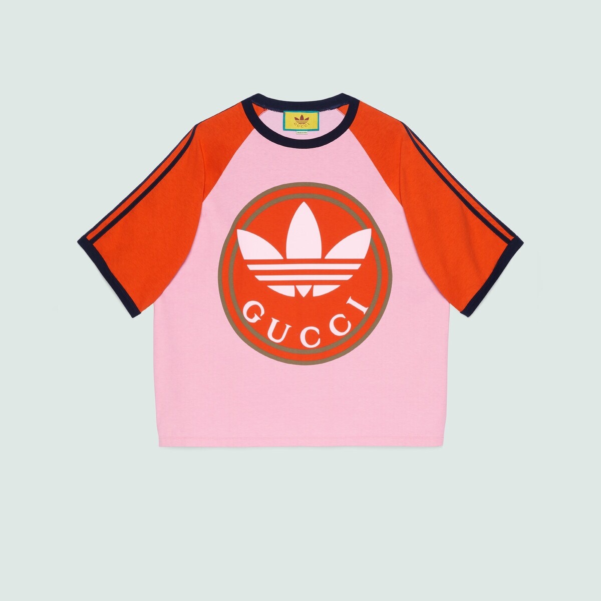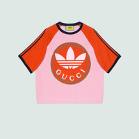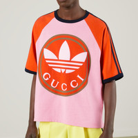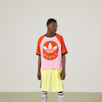 A second chapter in the adidas and Gucci collection, where the Web continues to juxtapose with the three white stripes and the GG monogram combines with the Trefoil. Pulling inspiration from the Creative Director’s memories of the '80s and '90s, emblematic House’s motifs mix with those of the historic sportswear brand adidas resulting in a series of hybrid looks. This cotton jersey T-shirt has contrast color details and the Gucci Trefoil print on the front. - Pink and brick red heavy cotton jersey - Gucci Trefoil print - adidas x Gucci - 3-Stripe - Raglan sleeves - Crewneck - The product shown in this image is a size small