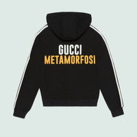 adidas and Gucci venture into a collection, where the Web juxtaposes with the three white stripes, and the GG monogram combines with the trefoil. Pulling inspiration from the Creative Director’s memories of the ‘80s and ‘90s, emblematic House’s motifs mix with those of the historic sportswear brand adidas resulting in a series of hybrid looks. This cotton sweatshirt features the Gucci Trefoil print. - Black felted cotton jersey - Multicolor Gucci Trefoil print - 'Gucci Metamorfosi' print on the back - adidas x Gucci - 3-Stripe - Hooded with drawstring - Front pocket - Made in Italy - The product shown in this image is a size small