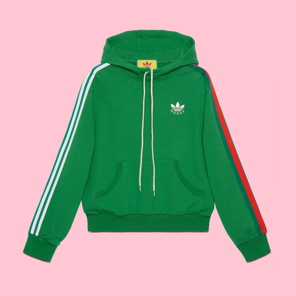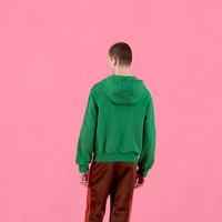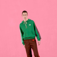adidas and Gucci venture into a collection, where the Web juxtaposes with the three white stripes, and the GG monogram combines with the trefoil. Pulling inspiration from the Creative Director’s memories of the ‘80s and ‘90s, emblematic House’s motifs mix with those of the historic sportswear brand adidas resulting in a series of hybrid looks. This cotton jersey sweatshirt is finished with the Gucci Trefoil rubberized print - Green felted cotton jersey - Gucci Trefoil rubberized print - Multicolor 3-stripes appliqué - adidas x Gucci - Hooded with drawstring - Front pocket - Made in Italy - The product shown in this image is a size small