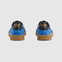 A second chapter in the adidas and Gucci collection, where the Web continues to juxtapose with the three white stripes and the GG monogram combines with the Trefoil. Pulling inspiration from the Creative Director’s memories of the '80s and '90s, emblematic House’s motifs mix with those of the historic sportswear brand adidas resulting in a series of hybrid looks. The signature Gazelle sneaker appears in blue Original GG canvas. - Blue Original GG canvas - Men's - Details in Demetra—crafted from animal-free raw materials that are primarily from sustainable, renewable, and bio-based sources - adidas x Gucci - 'Gazelle' embroidery - 3-Stripes insert - Gucci Trefoil print - GG embossed transparent outsole - Rubber sole - Your adidas x Gucci Gazelle sneakers will differ from your usual Gucci size, please refer to the dedicated size guide. - Additional pair of laces included - Lace-up closure - Low heel - 1.3" height - Made in Italy - This item fits large, we recommend purchasing a ½ size down