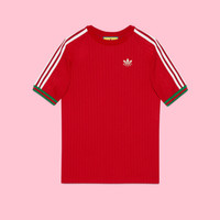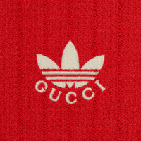 Emblematic House’s motifs mix with those of the historic sportswear brand adidas. The collection sees both heritages encoded in a trio of lines, where adidas and Gucci combine archival emblems. Creative Director, Alessandro Michele pulls inspiration from his memories of the ‘80s and ‘90s for a collection that is both nostalgia-driven and contemporary. This polyester blend jersey shirt has the Gucci Trefoil embroidery on the front and 3-stripes on the sleeves. - Red polyester blend jersey - Gucci Trefoil embroidery on the front - 3-stripes appliqué on the sleeves - adidas x Gucci - Web contrast rib detail on the cuffs - Raglan sleeves - Made in Italy - The product shown in this image is a size small