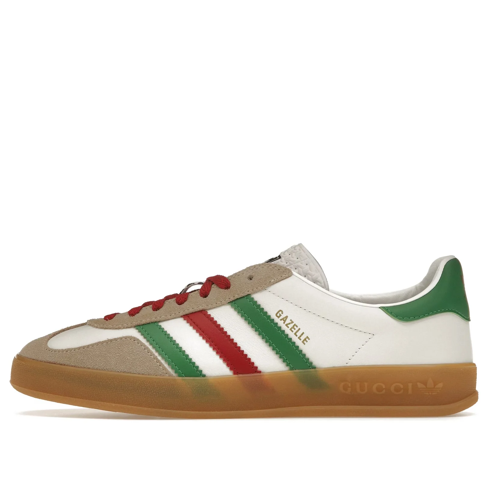 adidas and Gucci venture into a collection, where the Web juxtaposes with the three white stripes, and the GG monogram combines with the trefoil. Pulling inspiration from the Creative Director’s memories of the ‘80s and ‘90s, emblematic House’s motifs mix with those of the historic sportswear brand adidas resulting in a series of hybrid looks. This Gazelle sneaker is enriched with Gucci Trefoil details. - White leather with oatmeal suede - Men's - Details in Demetra—crafted from animal-free raw materials that are primarily from sustainable, renewable, and bio-based sources - adidas x Gucci - Gucci Trefoil label - Gucci Trefoil print - 3-Stripe insert - 'Gazelle' print - Gucci Trefoil embossed - Rubber sole - Lace-up closure - Flat - Made in Italy - This item fits large, we recommend purchasing a ½ size down