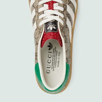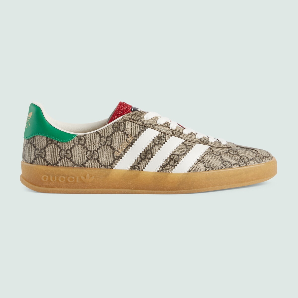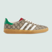 A second chapter in the adidas and Gucci collection, where the Web continues to juxtapose with the three white stripes and the GG monogram combines with the Trefoil. Inspired by the '80s and '90s, emblematic House’s motifs mix with those of the historic sportswear brand adidas resulting in a series of hybrid looks. The signature Gazelle sneaker appears in beige and ebony GG Supreme canvas. - Beige and ebony GG Supreme canvas - Men's - Details in Demetra—crafted from animal-free raw materials that are primarily from sustainable, renewable, and bio-based sources - adidas x Gucci - Gucci Trefoil label - Gucci Trefoil print - 3-Stripe insert - 'Gazelle' embroidery - Rubber sole - Additional pair of laces included - Lace-up closure - Low heel - 1.3" height - Made in Italy - This item fits large, we recommend purchasing a ½ size down