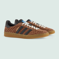 adidas and Gucci venture into a collection, where the Web juxtaposes with the three white stripes, and the GG monogram combines with the trefoil. Pulling inspiration from the Creative Director’s memories of the ‘80s and ‘90s, emblematic House’s motifs mix with those of the historic sportswear brand adidas resulting in a series of hybrid looks. This Gazelle sneaker is enriched with Gucci Trefoil details. - Brown and black Square G suede and leather - Men's - Details in Demetra—crafted from animal-free raw materials that are primarily from sustainable, renewable, and bio-based sources - adidas x Gucci - Gucci Trefoil label - Gucci Trefoil print - 3-Stripe insert - 'Gazelle' embroidery - Gucci Trefoil embossed - Rubber sole - Your adidas x Gucci Gazelle sneakers will differ from your usual Gucci size, please refer to the dedicated size guide. - Flat - Made in Italy - This item fits large, we recommend purchasing a ½ size down