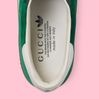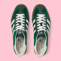 adidas and Gucci venture into a collection, where the Web juxtaposes with the three white stripes, and the GG monogram combines with the trefoil. Pulling inspiration from the Creative Director’s memories of the ‘80s and ‘90s, emblematic House’s motifs mix with those of the historic sportswear brand adidas resulting in a series of hybrid looks. These green suede Gazelle sneakers have the Gucci Trefoil print. - Green suede white details in Demetra—crafted from animal-free raw materials that are primarily from sustainable, renewable, and bio-based sources - Men's - Green suede - adidas x Gucci - Gucci Trefoil label - Gucci Trefoil print - White three stripes insert - 'Gazelle' embroidery - Gucci Trefoil embossed - Rubber sole - Lace-up closure - Made in Italy