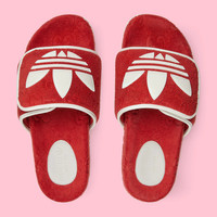Emblematic House’s motifs mix with those of the historic sportswear brand adidas. The collection sees both heritages encoded in a trio of lines, where adidas and Gucci combine archival emblems. Creative Director, Alessandro Michele pulls inspiration from his memories of the ‘80s and ‘90s for a collection that is both nostalgia-driven and contemporary. These red GG cotton sponge platform sandals have the Trefoil leather patch. - Red GG cotton sponge - Men's - White Trefoil leather patch - adidas x Gucci - White Demetra trim—crafted from animal-free raw materials that are primarily from sustainable, renewable, and bio-based sources with yellow and white rubber details - Rubber sole - Adjustable velcro strap - Low heel - Made in Italy