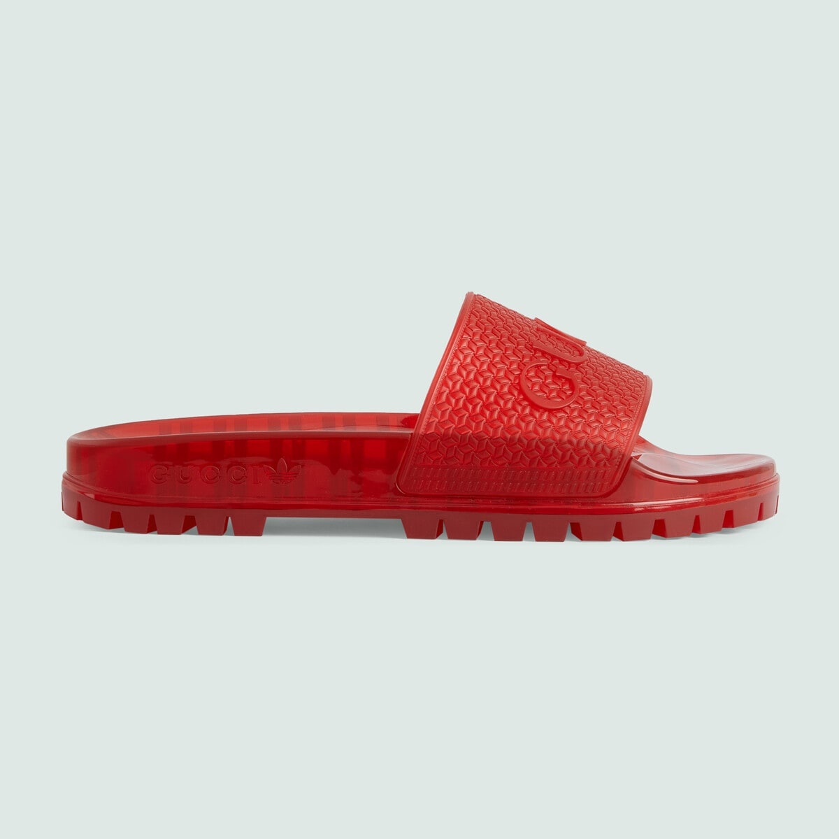 A second chapter in the adidas and Gucci collection, where the Web continues to juxtapose with the three white stripes and the GG monogram combines with the Trefoil. Pulling inspiration from the Creative Director’s memories of the '80s and '90s, emblematic House’s motifs mix with those of the historic sportswear brand adidas resulting in a series of hybrid looks. This slide sandal appears in red geometric transparent rubber. - Red geometric transparent rubber - Men's - adidas x Gucci - Gucci adidas Trefoil rubber motif - Gucci Trefoil rubber detail - Lug rubber sole - Trefoil adidas Gucci rubber detail - Flat - .4" height, based on a size 43(IT)