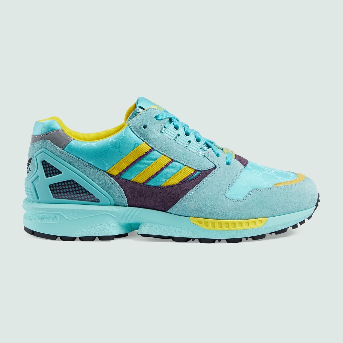 A second chapter in the adidas and Gucci collection, where the Web continues to juxtapose with the three white stripes and the GG monogram combines with the Trefoil. Pulling inspiration from the Creative Director’s memories of the '80s and '90s, emblematic House’s motifs mix with those of the historic sportswear brand adidas resulting in a series of hybrid looks. A Torsion sneaker in suede and GG canvas. - Aquamarine suede and GG canvas - Men's - adidas x Gucci - 3-Stripes - Gucci Trefoil Torsion label - Gucci Trefoil embroidery - Rubber sole - Lace-up - Low heel - Made in Italy