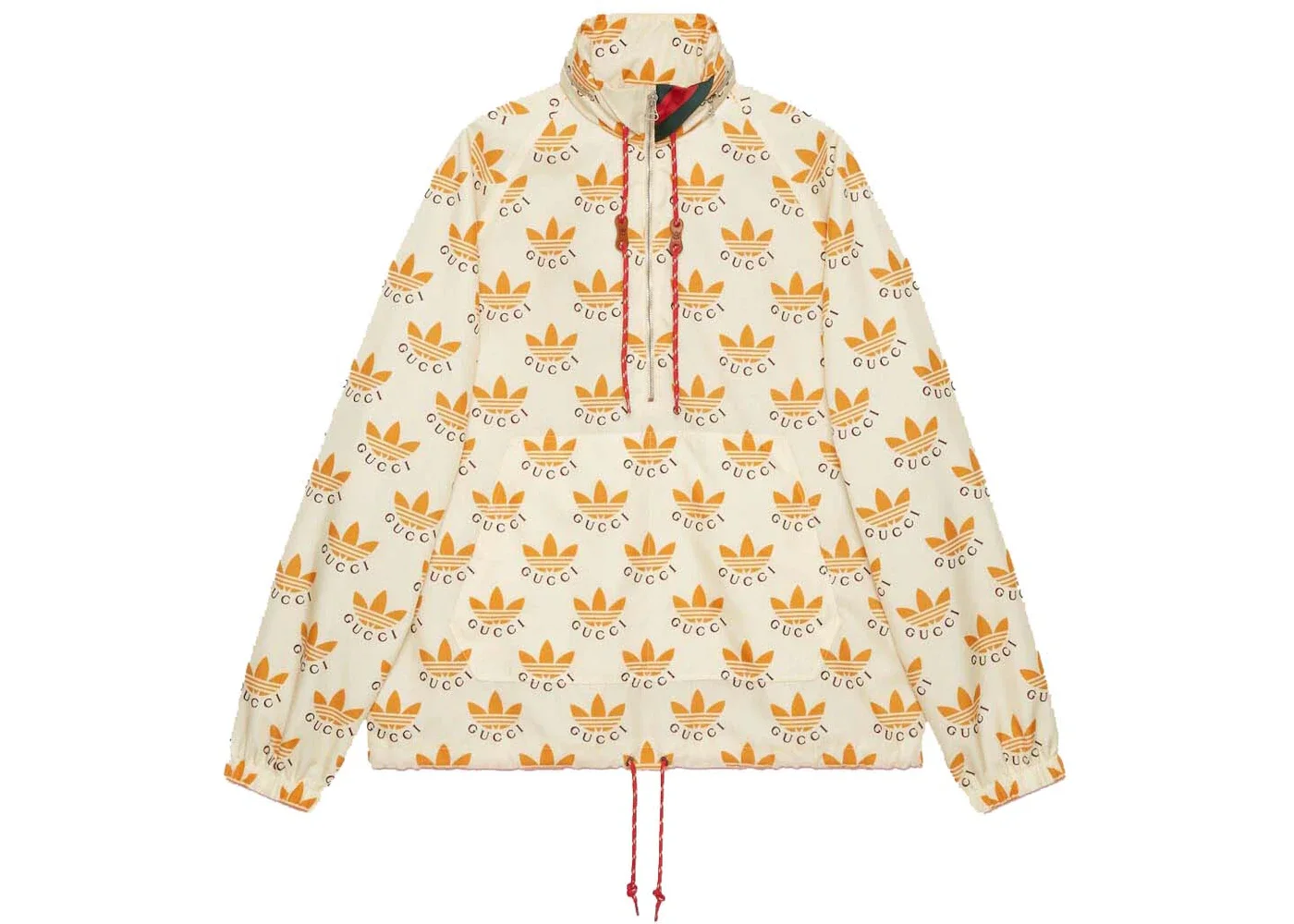 adidas and Gucci venture into a collection, where the Web juxtaposes with the three white stripes, and the GG monogram combines with the trefoil. Pulling inspiration from the Creative Director’s memories of the ‘80s and ‘90s, emblematic House’s motifs mix with those of the historic sportswear brand adidas resulting in a series of hybrid looks. This nylon canvas jacket has an Interlocking G and Trefoil print. - Ivory and brown nylon canvas with Interlocking G and Trefoil print - Green and red Web label - adidas x Gucci - Partial zip - Hidden hood - Front pocket - Made in Italy - The product shown in this image is a size 48 (IT)