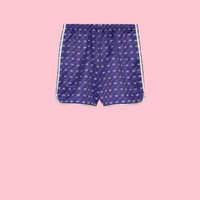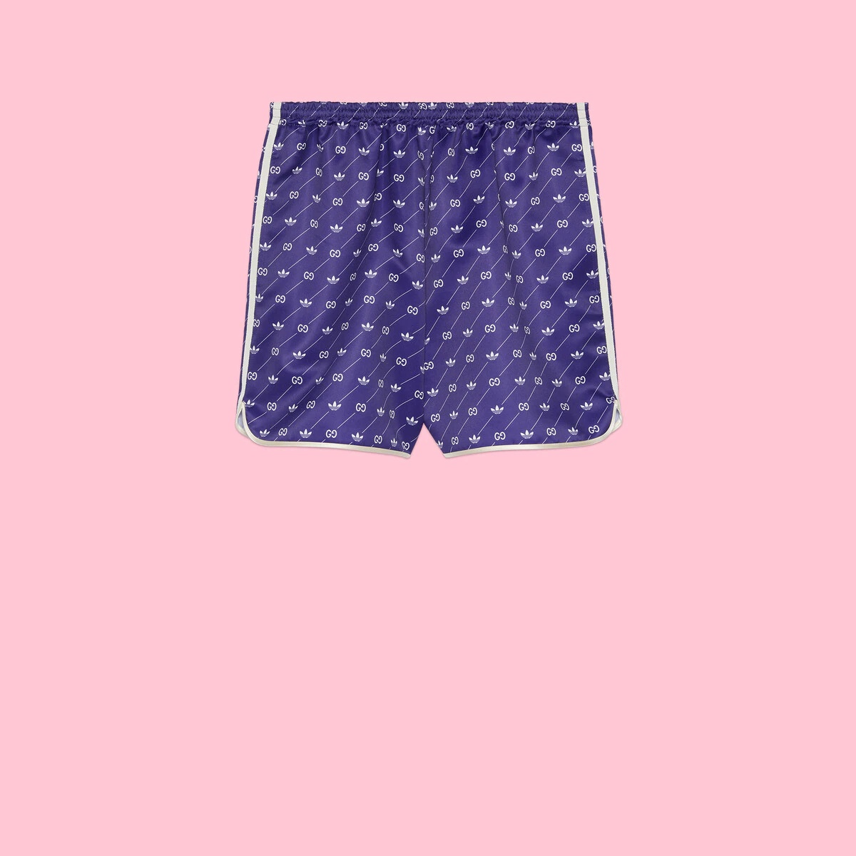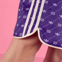 Emblematic House’s motifs mix with those of the historic sportswear brand adidas. The collection sees both heritages encoded in a trio of lines, where adidas and Gucci combine archival emblems. Creative Director, Alessandro Michele pulls inspiration from his memories of the ‘80s and ‘90s for a collection that is both nostalgia-driven and contemporary. These polyester blend shorts are crafted in Interlocking G and Trefoil diagonal stripe print. - Ivory and blue polyester blend Interlocking G and Trefoil diagonal stripe print - 3-stripes appliqué - Contrast binding on the hem - adidas x Gucci - Elastic waistband with tunnel tie - Back patch pockets - Made in Italy - The product shown in this image is a size 46 (IT)