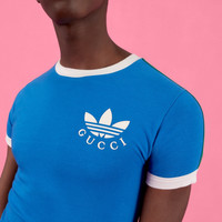 adidas and Gucci venture into a collection, where the Web juxtaposes with the three white stripes, and the GG monogram combines with the trefoil. Pulling inspiration from the Creative Director’s memories of the ‘80s and ‘90s, emblematic House’s motifs mix with those of the historic sportswear brand adidas resulting in a series of hybrid looks. This cotton jersey T-shirt with finished with the Gucci Trefoil rubberized print. - Blue cotton jersey - Gucci Trefoil rubberized print - Contrast rib on collar and cuffs - adidas x Gucci - Multicolor 3-stripes grosgrain on the sleeves - Slim fit - Made in Italy - The product shown in this image is a size small