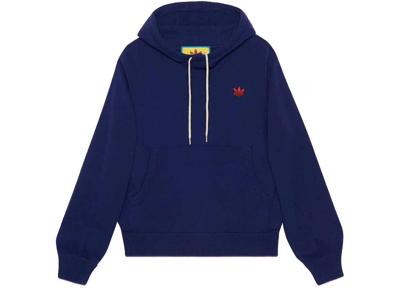 Emblematic House’s motifs mix with those of the historic sportswear brand adidas. The collection sees both heritages encoded in a trio of lines, where adidas and Gucci combine archival emblems. Creative Director, Alessandro Michele pulls inspiration from his memories of the ‘80s and ‘90s for a collection that is both nostalgia-driven and contemporary. This hooded wool sweatshirt has the Gucci Trefoil embroidery on the front. - Dark blue wool - Gucci Trefoil embroidery - adidas x Gucci - Hooded - Front pockets - Made in Italy - The product shown in this image is a size small