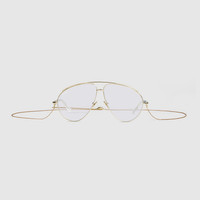 In the Fall Winter 2025 collection, these pilot optical frames feature an engraved Gucci logo detail and a tonal metal chain with an Interlocking G logo on the adjustable closure. - Shiny gold-toned metal frames - Shiny gold-toned metal temples with engraved Gucci logo, clear end tips and gold-toned metal chain with Interlocking G logo on the adjustable closure - Clear lens - GG1654S - Temple length: 0.5"; Lens height: 2.2"; Nose bridge length: 0.3" - Frame height: 2.4"; Frame width: 5.7"; Hinge to hinge: 5.5" - Made in Italy - The eyewear case in the House’s signature Rosso Ancora red hue is complete with a magnetic closure and white interior