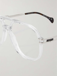 Gucci Eyewear's aviator-style glasses have been made in Italy from lightweight yet durable acetate and detailed with signature logo plaques along the silver-tone arms. The lenses are clear, so you can have them swapped out for prescription or UV-protective ones. Size & Fit - Tonal-brown and black acetate, gold-tone metal - Come with a case - Can be fitted with prescription or UV-protective lenses - Frame Width: 15cm / 5.9in - Frame Height: 5.5cm / 2.2in Details & Care - Clear acetate, silver-tone metal - Come with a case - Can be fitted with prescription or UV-protective lenses
