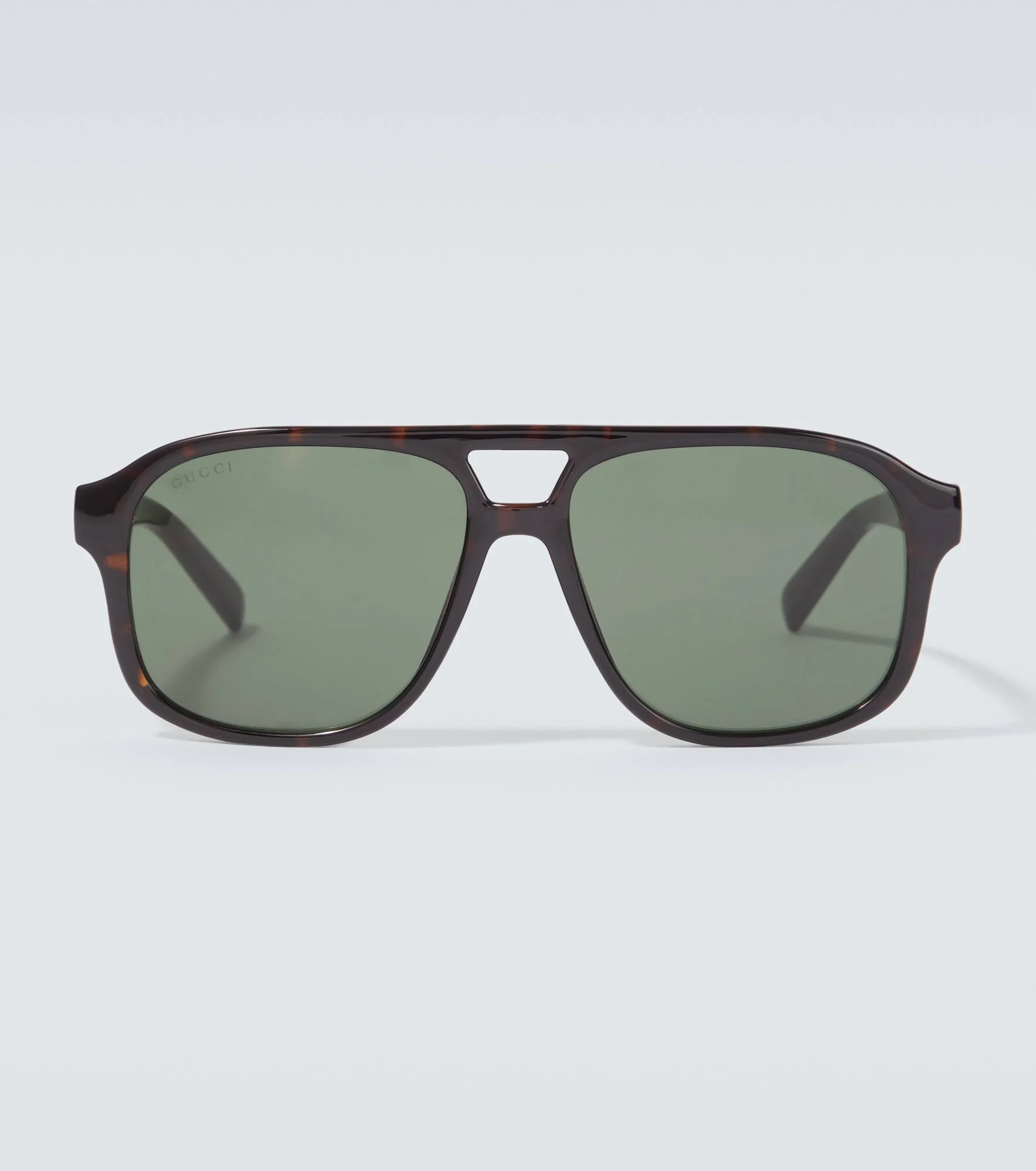 These sunglasses from Gucci are made in Italy to an aviator silhouette. They feature square-shaped slightly oversized frames and tinted lenses. Product Details - Frame material: acetate - Frame color: brown - Lens filter category 3 - Lens color: green - Made in Italy - Includes: logo-embossed hard case , cleaning cloth - The color of the case may vary - Item number: P01054548 Size & Fit - Lens width: 55mm-2.15" - Bridge size: 16mm-0.65" - Earpiece length: 146mm-5.75"
