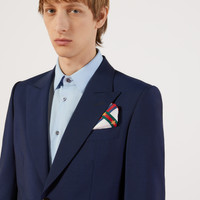 The silk pocket square is embellished with a scattering of bees—a symbol first used in Gucci ready-to-wear in the 1970s and reintroduced from the archives. Trimmed with the classic Web stripe. - White organic silk with allover bee pattern - Green and red and blue and red Web details with yellow bee - Hand-finished edges - W45cm x L45cm - Made in Italy