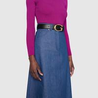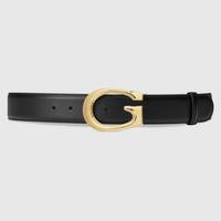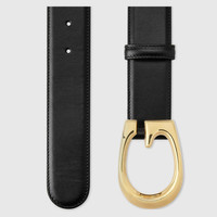 This leather belt is set with a G buckle with a shape reminiscent of Gucci designs from the seventies—a hallmark era of the House that continues to influence its narrative. - Black leather - Shiny gold-toned hardware - G buckle - 1.6" width - Made in Italy - Can be worn as a hip or waist belt. Sizing will differ based on where the belt is worn, please refer to the size guide to find your size.