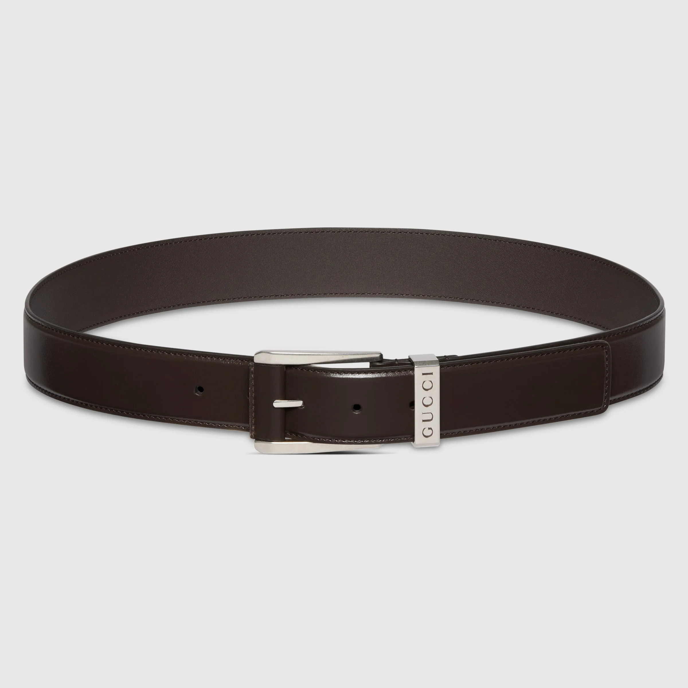 The signature combination of sophisticated leather in neutral shades and a rectangular buckle effortlessly completes business and formal looks. This wide belt is stated in a smooth leather and features a squared buckle with Gucci engraving on a metal loop. - Dark brown smooth leather - Palladium-toned hardware - Squared buckle with Gucci engraving on metal loop - 1.3" width - Made in Italy - Can be worn as a hip or waist belt. Sizing will differ based on where the belt is worn, please refer to the size guide to find your size.