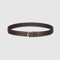 The House continues to reinterpret emblematic motifs, from the GG, Web, Flora, bamboo, Horsebit and equestrian inspirations, in sumptuous materials, intricate craftsmanship, and fresh hues. This leather belt is defined by a stirrup buckle and reveals a Gucci logo detail across the belt loop. - Dark brown leather - Palladium-toned hardware - Stirrup buckle - Gucci logo detail - 1.5" width - Can be worn as a hip belt. Sizing will differ based on where the belt is worn, please refer to the size guide to find your size.