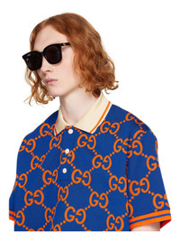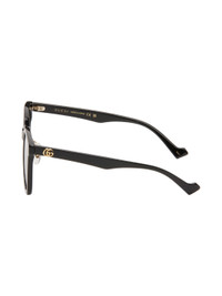 Round acetate-frame sunglasses in black. · Gray lenses · Adjustable rubber nose pads · Gold-tone logo hardware at temples · Includes case · Size: 55.20 145 Supplier color: Black/Black/Grey