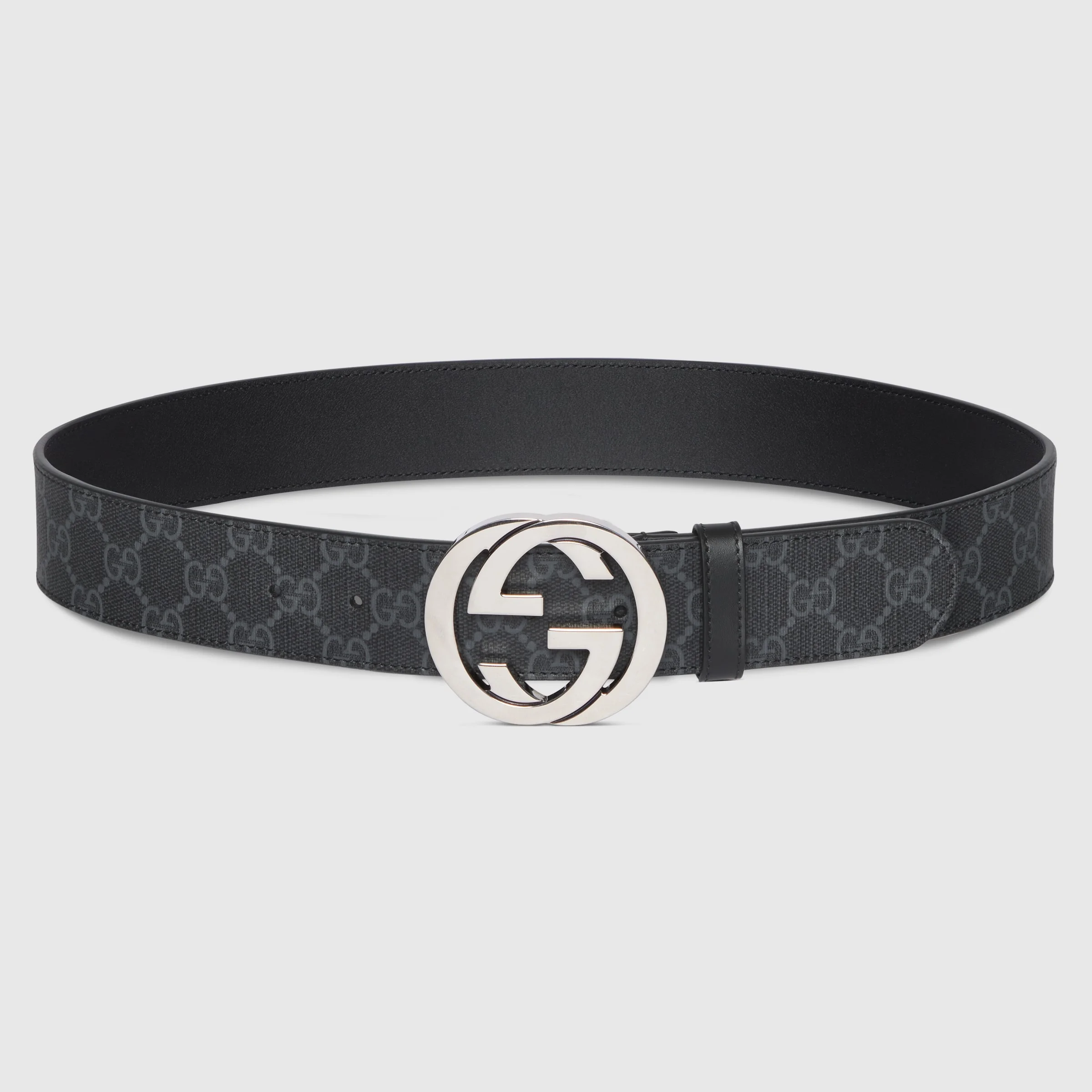 A GG Supreme canvas belt finished with interlocking G buckle. - Black/grey GG Supreme canvas, with black leather trim - Palladium-toned hardware - Interlocking G buckle - 1.5" width - Made in Italy - Can be worn as a hip or waist belt. Sizing will differ based on where the belt is worn, please refer to the size guide to find your size.