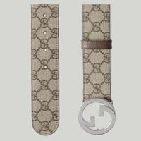 Accessories continue to play upon heritage elements. Here, the historic GG monogram appears distinguished by an archival iteration of the House's rounded Interlocking G hardware. This belt is crafted from beige and ebony GG Supreme canvas with brown leather trim. - Beige and ebony Supreme canvas - Brown leather trim - Palladium-toned hardware - Round Interlocking G buckle - 1.6" belt width - Made in Italy - Can be worn as a hip belt. Sizing will differ based on where the belt is worn, please refer to the size guide to find your size.