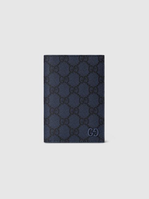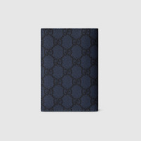 This passport case has been crafted from soft GG Supreme and reveals an unexpected contrasting leather trim. A GG detail with a ceramic-effect completes the piece. - Dark blue soft GG Supreme - Dusty blue leather trim - Palladium hardware with blue ceramic-effect finishing - Moire lining - GG detail - Inside: 4 card slots, 1 passport pocket - Closed: 3.7"W x 5.3"H; Open: 7.5"W x 5.3"H - Weight: 0.158lbs approximately - Made in Italy