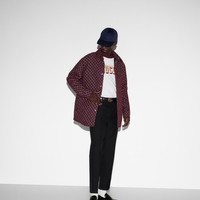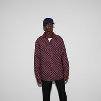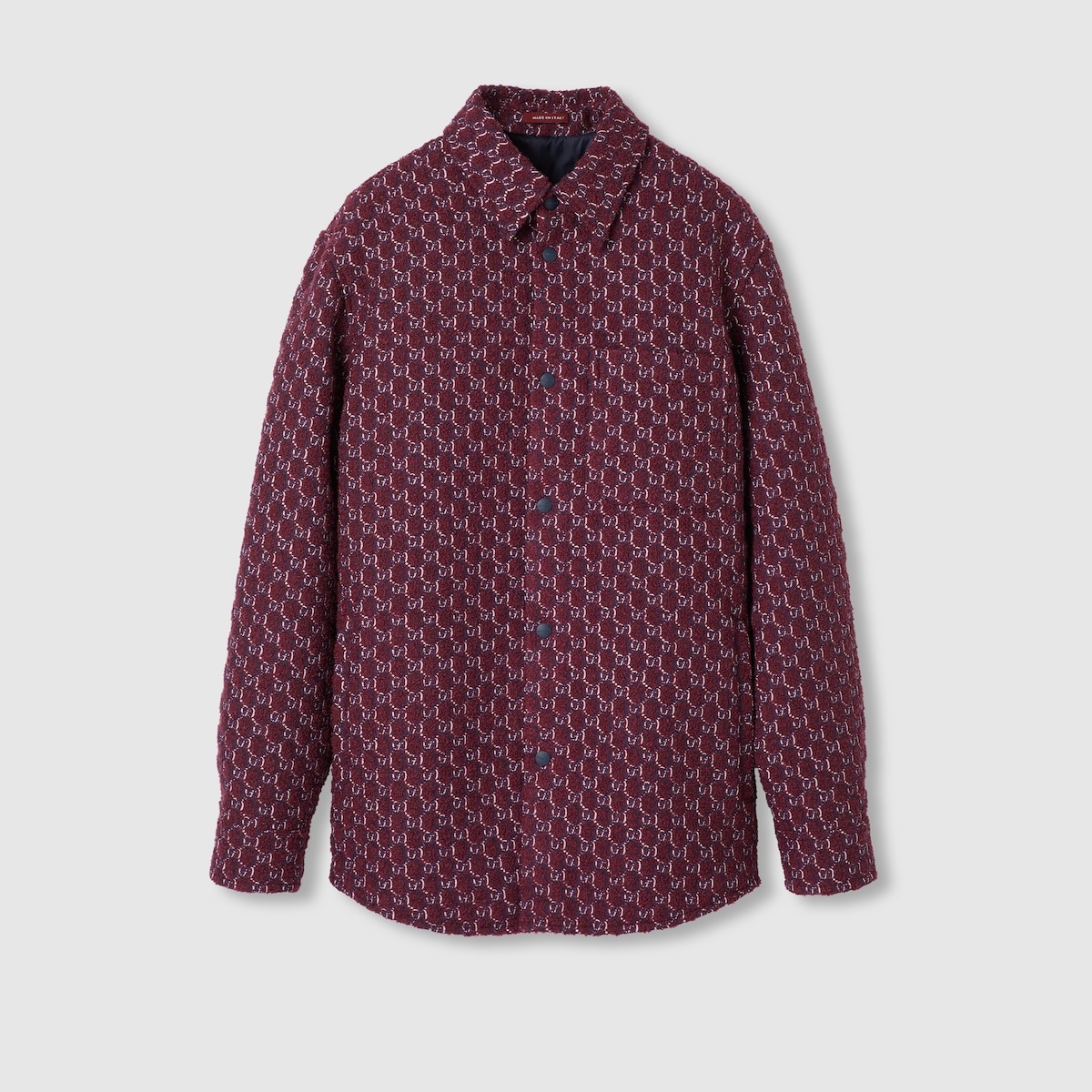 The GG motif appears in unexpected colors and fabric combinations, from linen blend to nylon. This oversized shirt has been crafted from a GG boucle wool jacquard, with a contemporary optical effect, and reveals a tonal lining. - Burgundy and blue boucle wool with GG Shadow - Lined - Point collar - Dropped shoulder - Long sleeves - Chest pocket - Padded - Shoulder drop: 20.4"; based on a size 48 (IT) - Chest: 24.8"; based on a size 48 (IT) - Sleeves length: 36.2"; based on a size 48 (IT) - Internal pocket - Snap button closure - Oversize fit - Length: 32.6"; based on a size 48 (IT) - Made in Italy - The product shown in this image is a size 48 (IT)