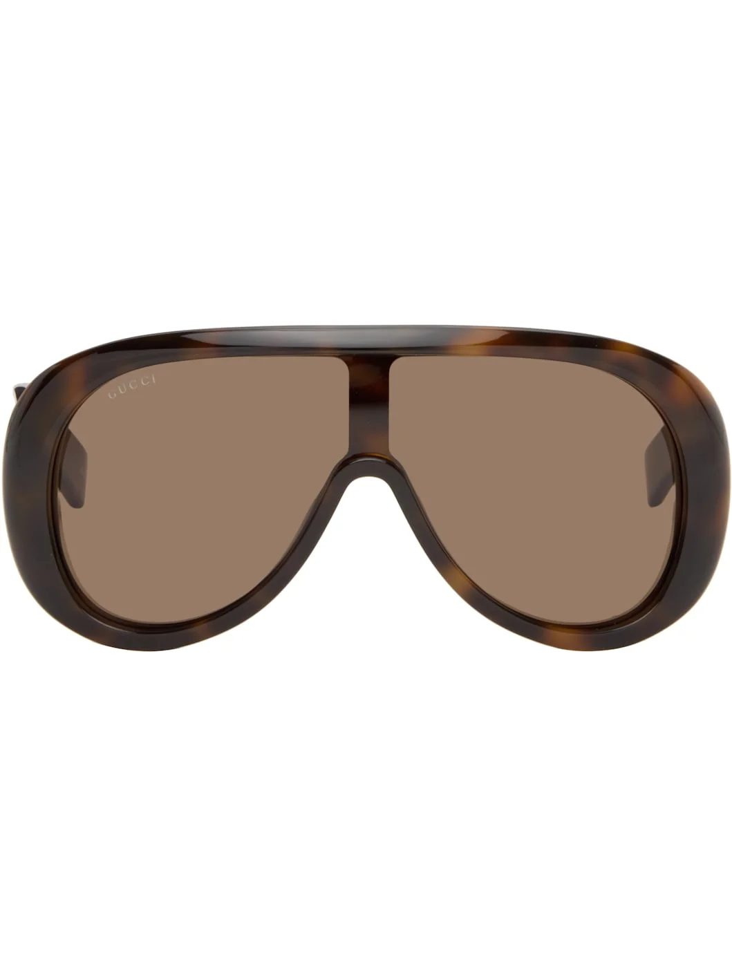 Shield-style semi-transparent tortoiseshell acetate-frame sunglasses. · Brown lens · 100% UVA/UVB protection · Logo etched at lens · Integrated nose pads · Inset logo hardware at temples · Exposed core wires · Includes pouch · Size: 130 Supplier color: Havana/Havana/Brown Acetate. Made in Japan 261451M134046