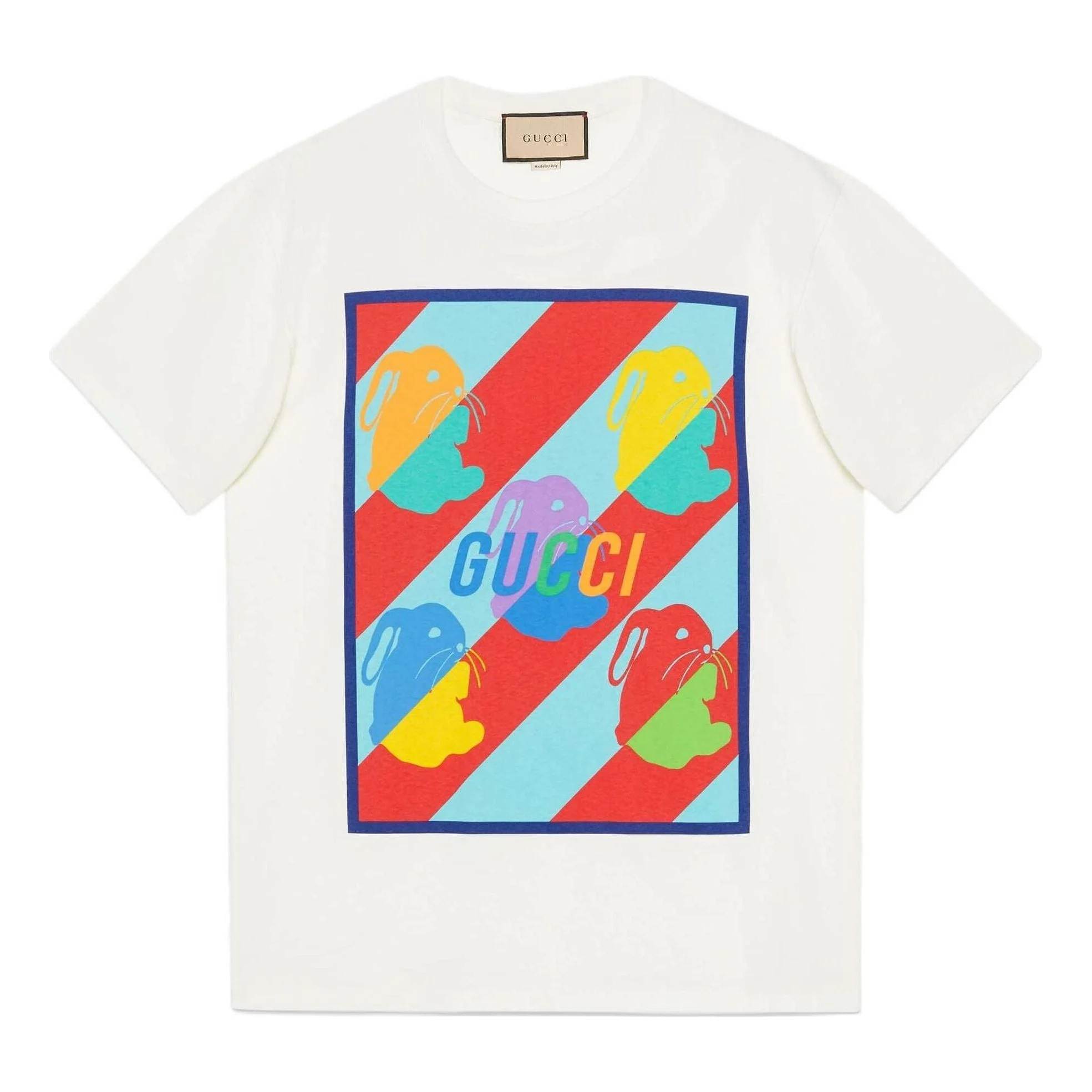 In celebration of the Year of the Rabbit, as well as the arrival of Spring, the House presents a wide-ranging selection of colorful ready-to-wear pieces and accessories featuring various renditions of the wistful creature. Animal motifs often feature in Gucci collections, sometimes accompanied by signature emblems or floral patterns as an expression of the House's fascination with the beauty of the natural world. - Ivory cotton jersey - Technicolor Gucci bunny print - Crewneck - Short sleeves - Made in Italy - The product shown in this image is a size small