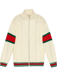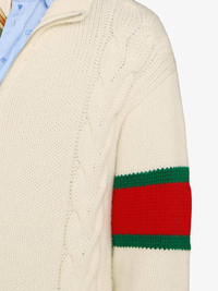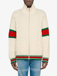 Inspired by American vintage sportswear, Gucci presents this cream, red and green wool cable-knit bomber jacket. Imbued with a preppy air, the knitted style is embellished with the House's iconic green and red web on the sleeves and on the trims. Fashion nostalgia at its best. Featuring a stand up collar, dropped shoulders, a front zip fastening, long sleeves, a cable knit, two front pockets and a signature green and red Web detail. Made in Italy Composition Wool 100%