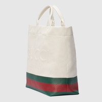 Characterized by its relaxed silhouette, this canvas tote bag denotes a natural texture for the warmer weather. A green and red Web colored trim highlights the base, while 'Gucci Made in Italy' is subtly embossed across the front. - Natural canvas - Web coated trim - 'Gucci Made In Italy' embossed detail - Top handle with 4.7" drop - Shoulder strap with 12.6" drop - Medium: 15.7"W x 15"H x 6.7"D - Made in Italy