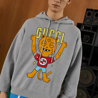 Artwork by Chile-based cartoonist and illustrator, Pablo Delcielo, adds joy and playfulness to Gucci Love Parade. Animated mythical creatures and fun fruit characters decorate ready-to-wear pieces and accessories in the form of vibrant patches and prints. This cotton jersey sweatshirt has poetry by Marilyn Monroe depicted on the back and artwork by Pablo Gelcielo on the front. - Grey light felted cotton jersey - Gucci cat print on the front - 'I can and will help myself and work on things analytically no matter how painful'—Poetry by Marilyn Monroe: Copyright LSAS, International all rights reserved. - Artwork by Pablo Delcielo - Fixed hood with drawstring - Long sleeves - Rib trim - Washed effect - Made in Italy - The product in this image is shown in a size medium