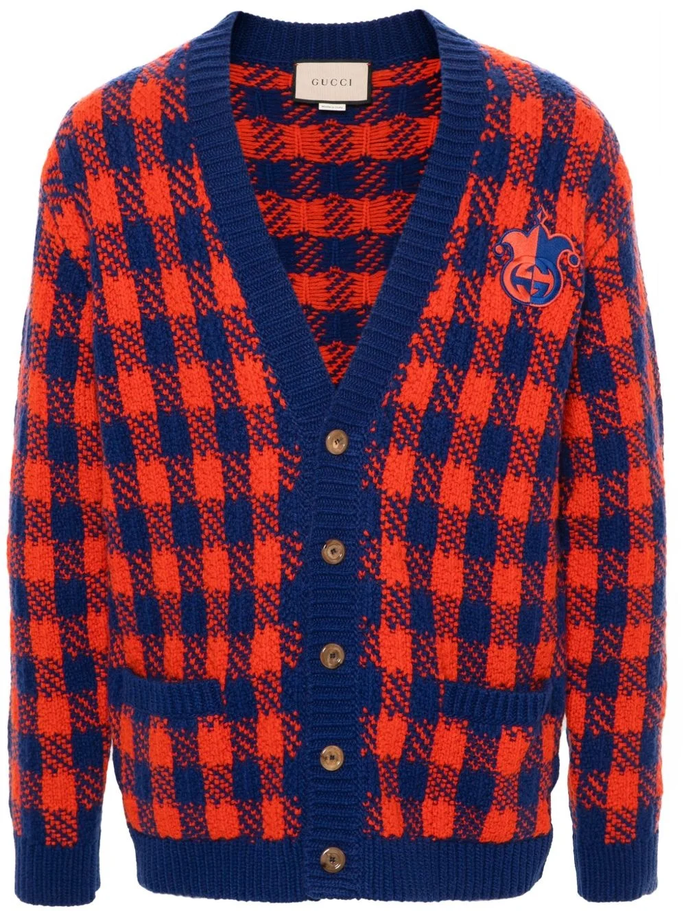 Interlocking GG gingham wool cardigan Highlights - Red/blue - Wool - Gingham check pattern - V-neck - Long sleeves - Ribbed cuffs and hem - Signature interlocking gg logo patch at the chest - Two front patch pockets - Straight hem - Front button fastening Made in Italy Composition Wool 100%, Polyester 100% SIZE & FIT Model measurements Height 6 ft 2 in(1.87 m) Bust/Chest 38.18 in(97 cm) Hips 36.61 in(93 cm) Waist 29.13 in(74 cm) FittingInformation Designed to be unstructured, offering a loose fit throughout The ribbed hem offers a close, comfortable fit Made from a midweight non-stretch fabric This piece fits true to size – take your usual size Washing instructions Dry Clean Only
