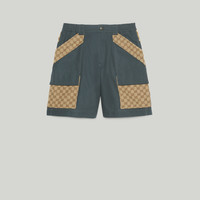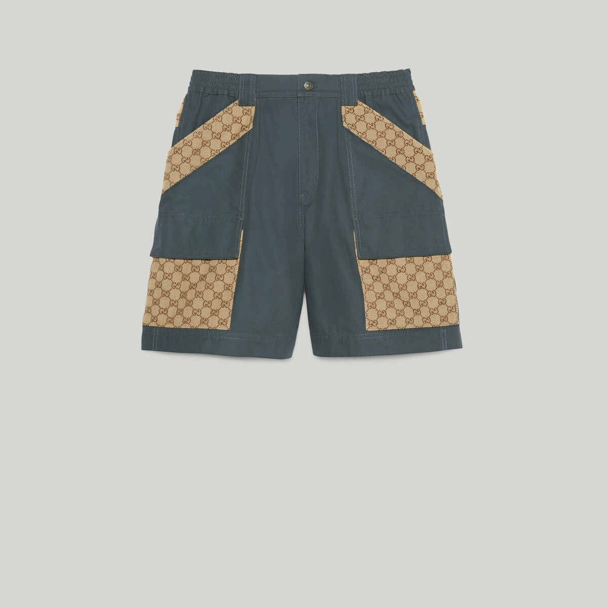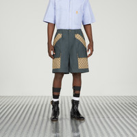 Crafted from a dark grey cotton canvas, these voluminous shorts brings together a retro appearance and contemporary elements inspired by sportswear silhouettes, like elastic details at the waistband. The House's historical monogram explores a fresh application, bringing definition to the oversized patch pockets across the front. - Dark grey cotton canvas - Beige and ebony GG canvas inserts - Elasticated waistband - Four front pockets - Two back pockets - Button and zip closure - Leg opening: 14.5" based on a size 48 (IT) - The product shown in this image is a size 48 (IT)