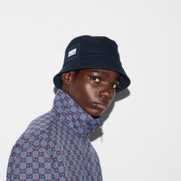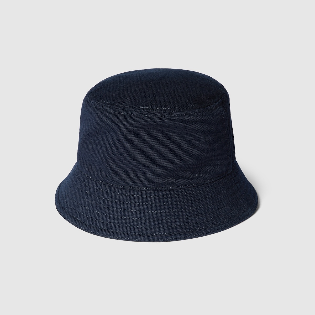 For the Cruise 2025 collection, signature symbols and codes of the House are reimagined in a modern way. Archival details and streetwear inspired shapes combine in a selection of soft accessories pieces. This bucket hat has been crafted from a cotton canvas and reveals a Gucci Interlocking G and Web embroidered label on one side. - Dark blue cotton canvas - Unlined - Gucci Web Interlocking G embroidered label - Made in Italy