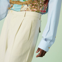 In a play between textures and applications, the most iconic motifs of the House enhance ready-to-wear designs throughout the Pre-Fall 2023 collection. Gucci’s signature mix of archive elements gets a contemporary twist, imbuing timeless pieces with a sophisticated yet modern touch. Here, a tonal Double G embroidery decorates these off white pants crafted from cotton drill. - Off white cotton drill - Double G embroidery on the back - Belt loops - Two side pockets - Back pockets - Pleated details - Button and zip closure - Turn up hem - Leg opening: 8.3" based on a size 46 (IT) - Made in Italy - The product shown in this image is a size 46 (IT)