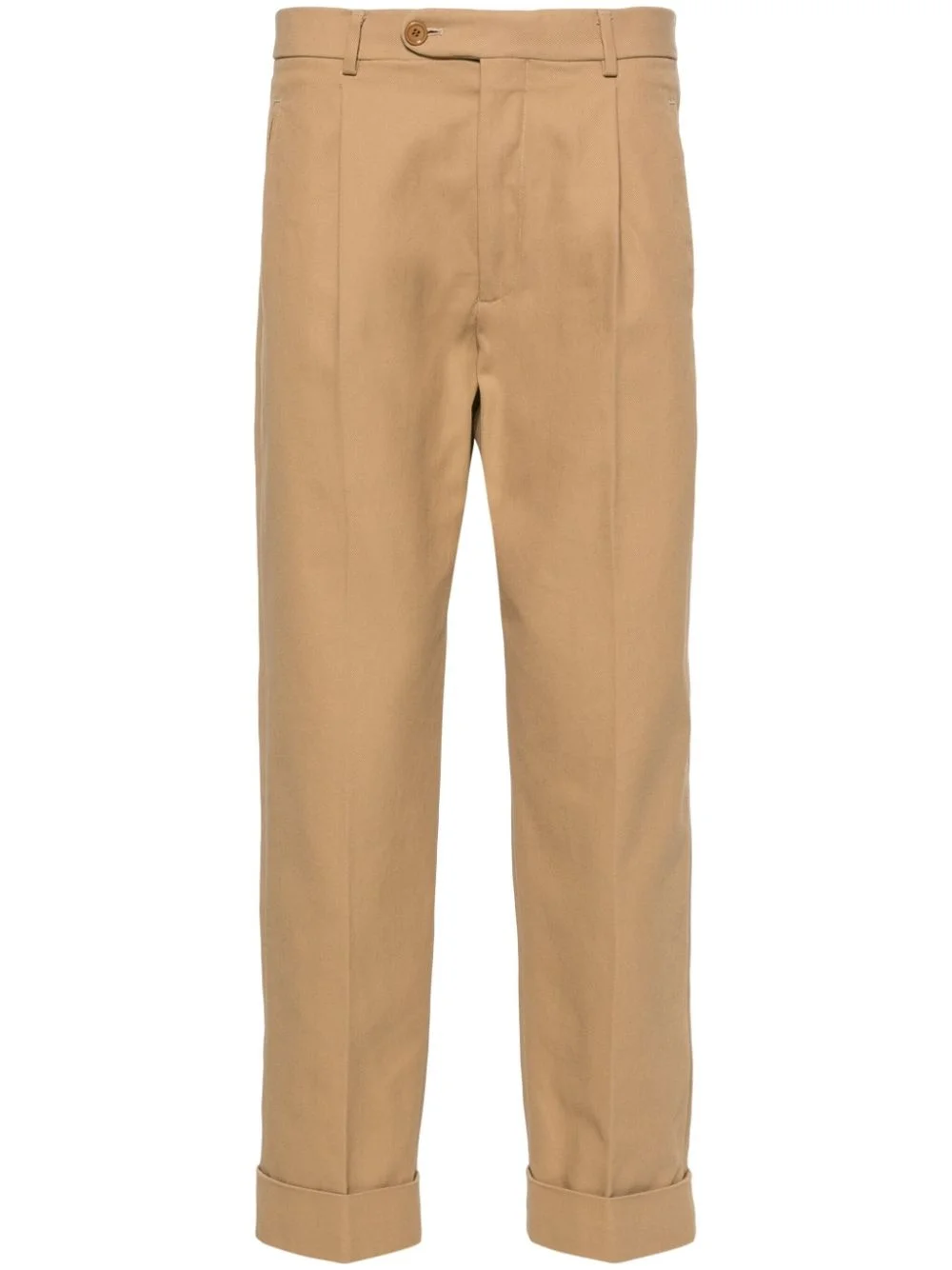Double G embroidered tailored trousers Highlights - Camel brown - Cotton - Twill weave - Pleat detailing - Pressed crease - Signature double g logo - Embroidered logo to the rear - Belt loops - Front button and zip fastening - Tapered leg - Two side inset pockets - Two rear flap pockets - Turn-up hem - Long length Made in Italy Composition Lining: Cotton 100% Outer: Cotton 100% SIZE & FIT Model measurements Height 6 ft 1 in(1.86 m) Bust/Chest 36.61 in(93 cm) Hips 37 in(94 cm) Waist 28.74 in(73 cm) FittingInformation Designed for a straight-leg, allowing for an unrestricted and comfortable fit over the leg Made from a midweight non-stretch fabric This piece fits true to size – take your usual size