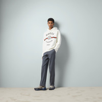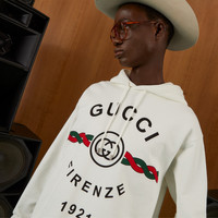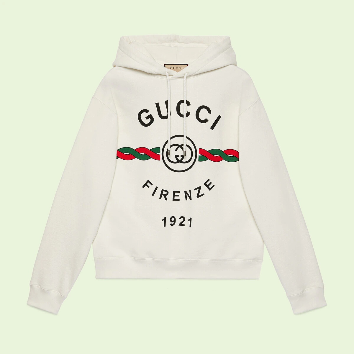 Over the past 100 years, the Gucci trademark has been used to identity and distinguish different points in the historic tenure of the House. Each symbol was stamped, embossed, printed or embroidered and represents the creative decision made during that specific time. Here, the 'Gucci 1921 Firenze' print speaks to the 100 year history of Gucci's beginnings in Florence, the placement as front and center leaves its own mark on the present phase of the brand. - White light felted cotton jersey - 'Gucci Firenze 1921' with Interlocking G and torchon print - Fixed hood with drawstring closure - Long sleeves - Ribbed hem and cuffs - Made in Italy - The model is 6'1" tall. The product shown in this image is a size medium